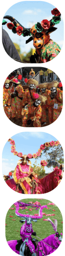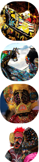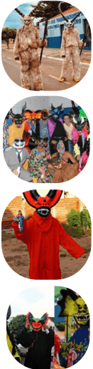 Confeccionadas em papel e materiais recicláveis, cores fortes / escuras e grande presença de chifres / dentes grandes. Figuras não humanas.